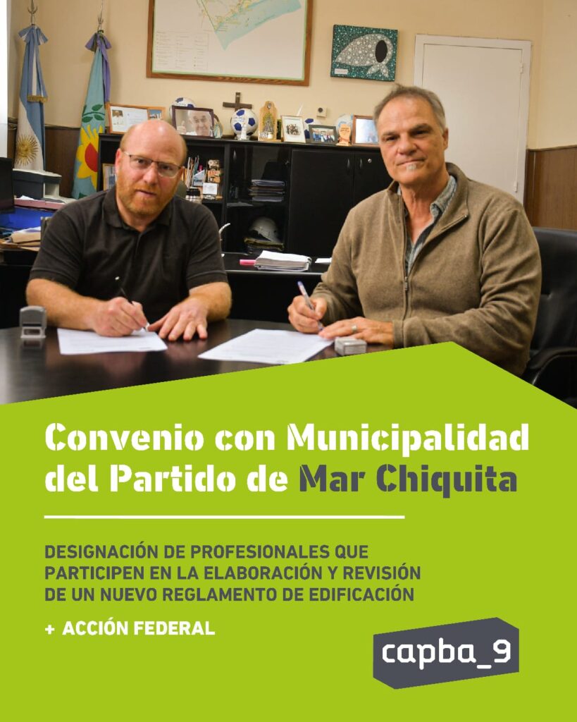 Fue suscripto por el presidente del CAPBA 9 Arq. Diego Domingorena y el intendente de la localidad de Mar Chiquita Arq. Walter Wischnivetzky y tiene como fin acordar el procedimiento para la designación de profesionales que participen en la elaboración y revisión de un nuevo Reglamento de Edificación para el Partido de Mar Chiquita que incorpore y regule los nuevos procesos, metodologías y materiales constructivos que se han implementado en la industria en los últimos años, con el fin de promover prácticas más eficientes y actualizadas.
