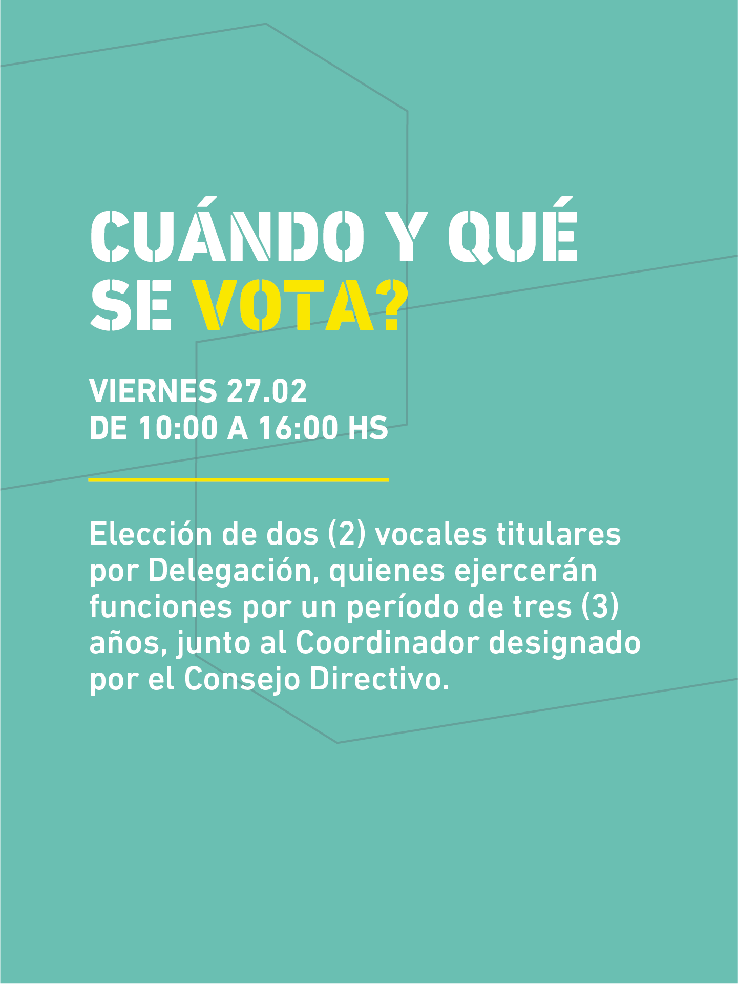 Las elecciones se realizarán el viernes 27 de febrero de 2026, en el horario de 10:00 a 16:00, y tendrán como objetivo la elección de dos (2) vocales titulares por Delegación, quienes ejercerán funciones por un período de tres (3) años, junto al Coordinador designado por el Consejo Directivo.