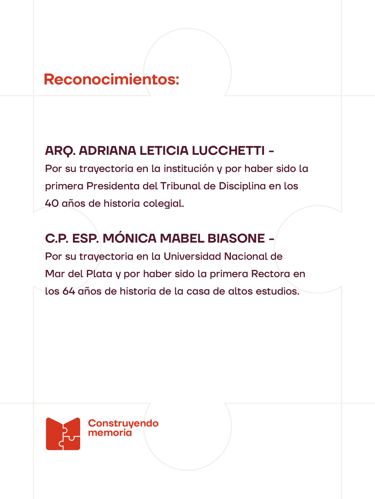 Arq. Adriana Leticia Lucchetti, por su trayectoria en la institución y por haber sido la primera Presidenta del Tribunal de Disciplina en los 40 años de historia colegial.