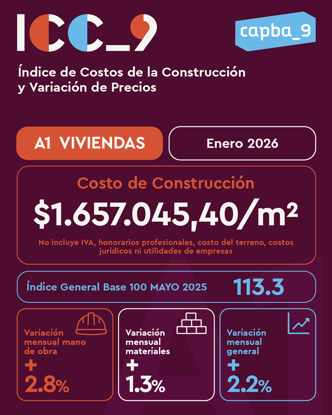 El Índice del Costo de la Construcción y Variación de Precios (ICC_9) correspondiente a Enero de 2026 registró una suba del 2,2 % respecto al mes anterior, en el sector de VIVIENDAS