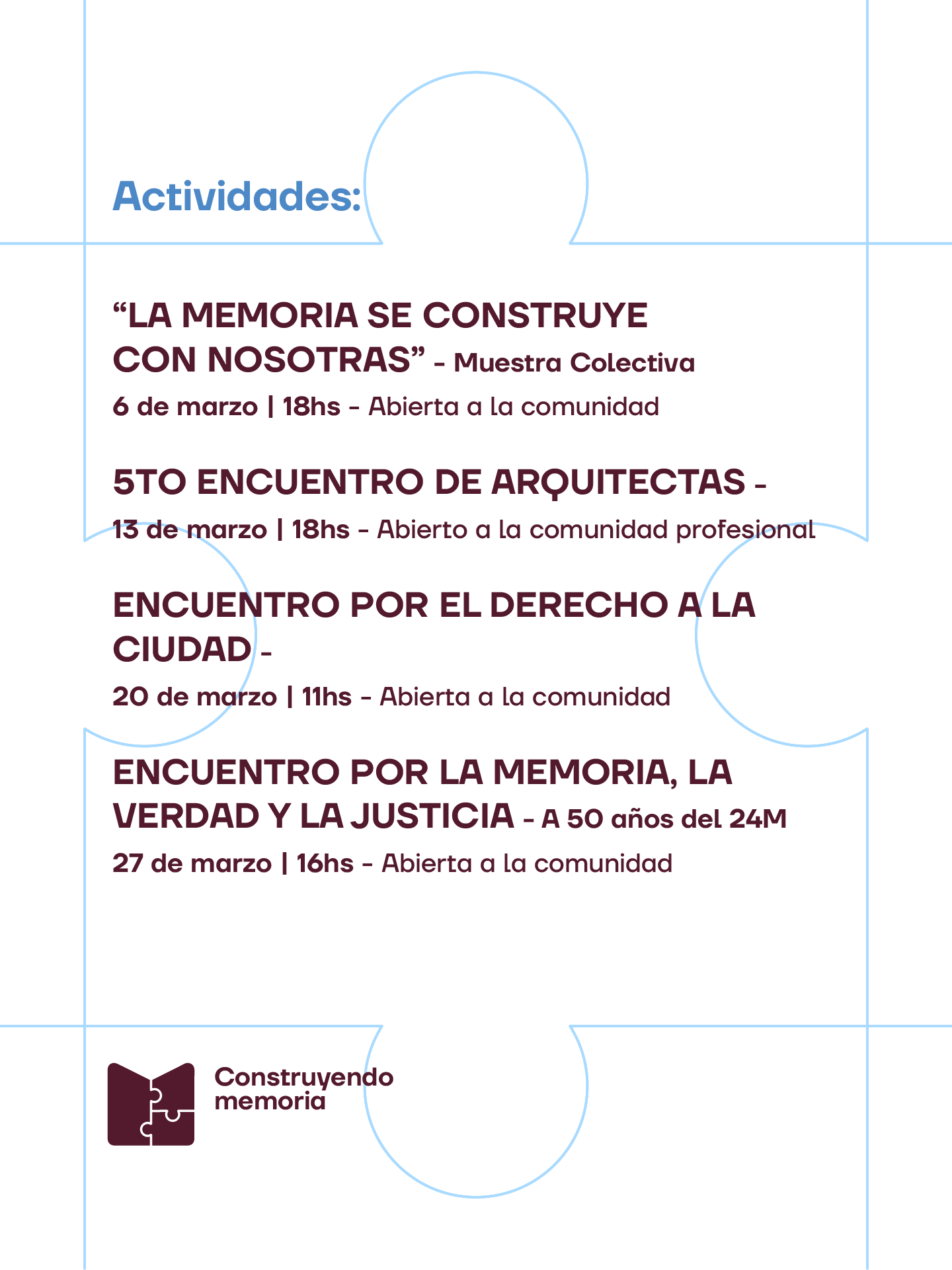 A lo largo del mes se llevarán adelante encuentros artísticos, profesionales e institucionales que ponen en diálogo memoria, igualdad y derecho a la ciudad, reafirmando el compromiso del Colegio con una práctica profesional ética, democrática y socialmente responsable.