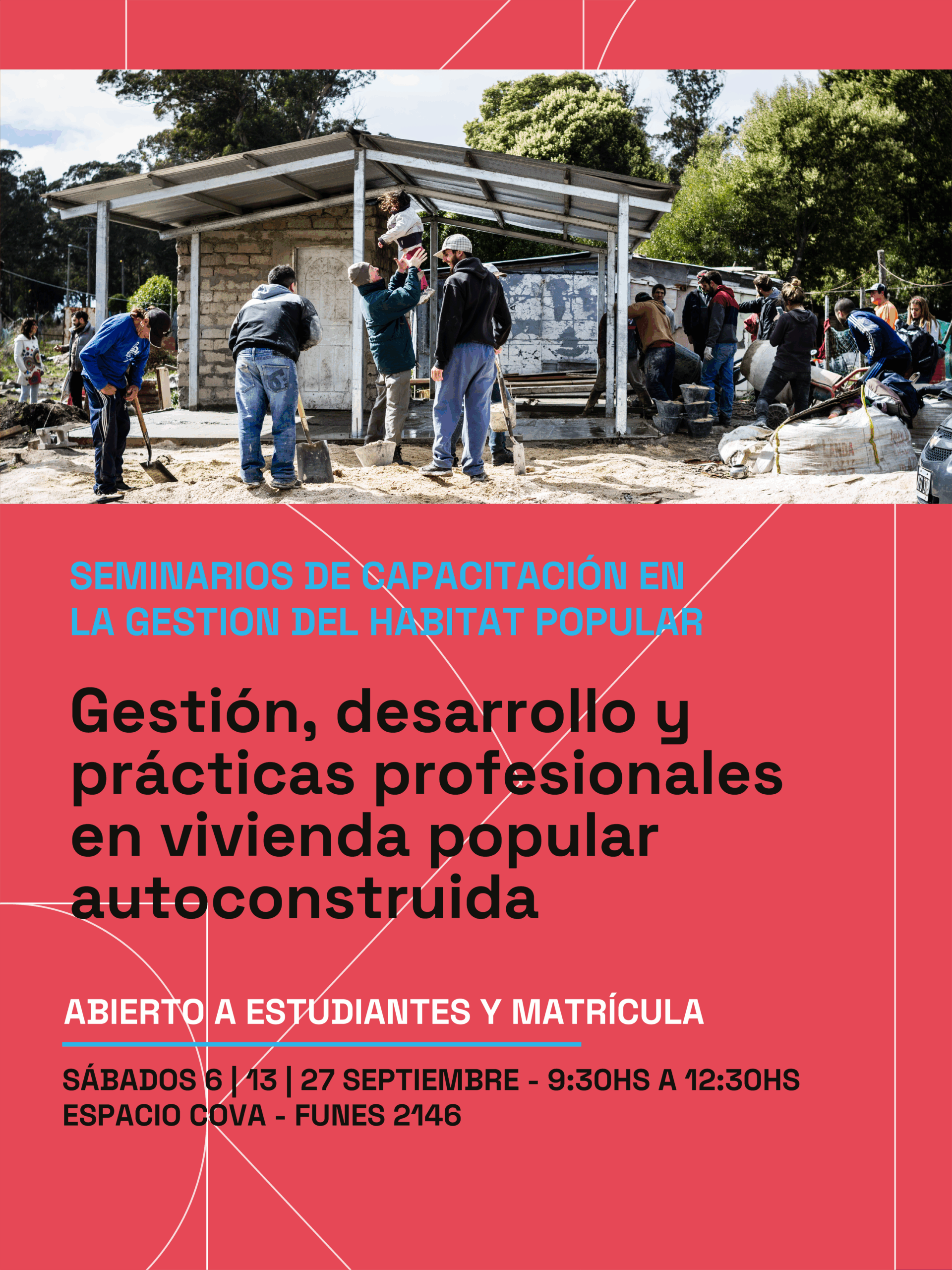 “GESTIÓN, DESARROLLO Y PRÁCTICAS PROFESIONALES EN VIVIENDA POPULAR AUTOCONSTRUIDA” CICLO DE FORMACIÓN Y CAPACITACIÓN orientado a profesionales matriculados, alumnos, graduados, docentes y afines, en temáticas de hábitat popular, autoconstrucción asistida y articulación interinstitucional.- Formulario de inscripción obligatorio.– Se entregará certificación de asistencia y participación como curso de extensión y diploma de participación.– Requisito: asistencia del … Sigue leyendo SEMINARIOS DE CAPACITACIÓN EN LA GESTIÓN DEL HÁBITAT POPULAR